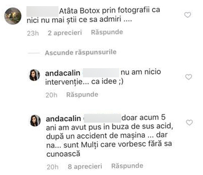 În urmă cu o zi, vedeta a postat o fotografie pe pagina sa de Instagram, iar un prieten virtual i-a comentat că ar avea anumite intervenţii estetice şi este departe de a fi naturală. “Atâta Botox prin fotografii ca nici nu mai ştii ce sa admire…”, este unul dintre mesajele transmise de un prieten virtual, la care bruneta nu s-a putut abţine şi i-a răspuns imediat. “Nu am nicio intervenţie…ca idee, doar că acum 5 ani am avut pus in buza de sus acid, după un accident de maşina … dar na… sunt mulţi care vorbesc fără sa cunoască”, a dezvăluit Anda Călin.