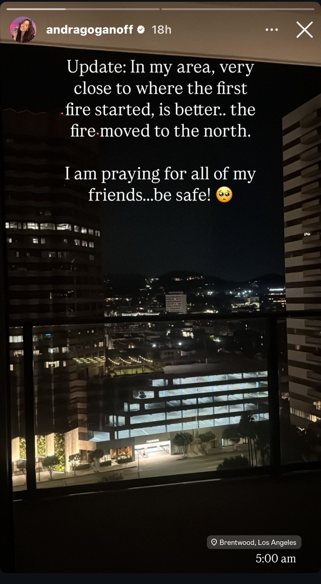 ”Update despre incendiile din Los Angeles. Încă nu s-a stins focul. Încă se vede fumul de aici cum crește. Vântul bate cu 100 de km/h. Nu am plecat încă, dar mi-am făcut bagajul cu cele necesare în caz de evacuare”, a scris Andra Gogan pe o rețea de socializare.