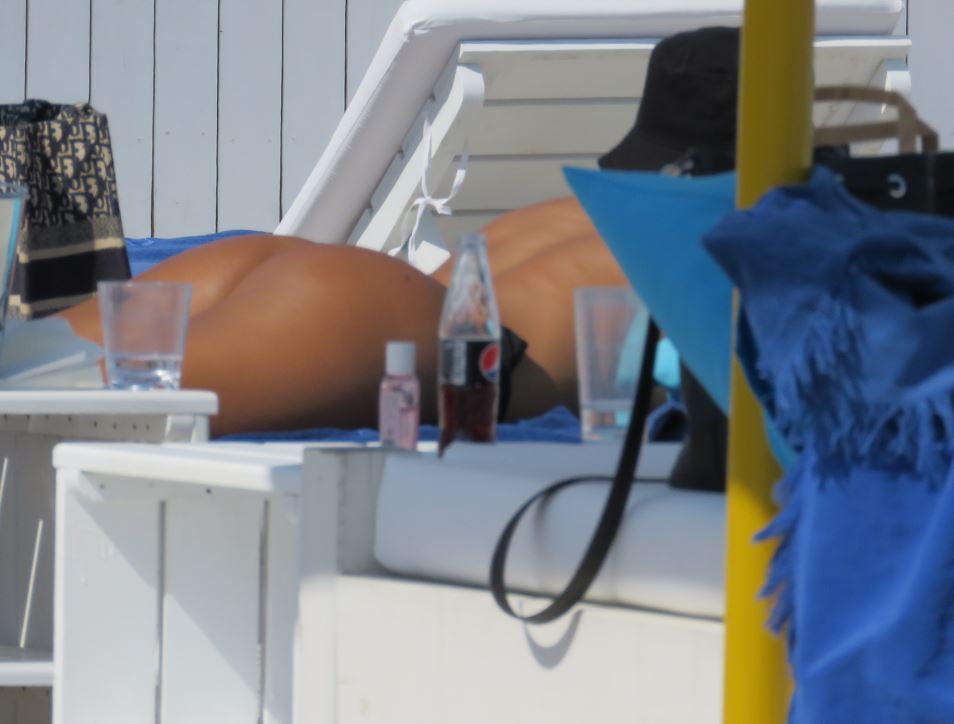 Întinsă pe șezlong, Andra Volos nu a mai rezistat și, dorind să se bronzeze uniform pe tot spatele, a renunțat la partea de sus a costumului de baie. A rămas întinsă preț de câteva zeci de minute cu fața în jos, timp în care cei cu privirea ageră i-au putut admira posteriorul perfect conturat. De razele soarelui, șatena si-a protejat capul cu o pălărie neagră, iar setea și-a potolit-o cu apă și suc, după cum a simțit nevoia.