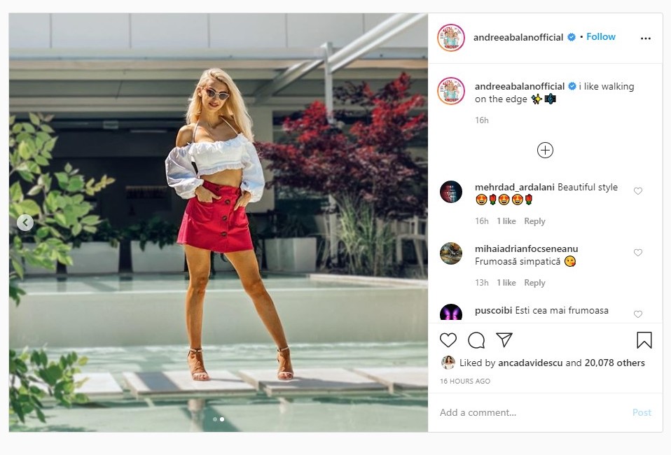 În imagine, Andreea este îmbrăcată cu o fustă scurtă roz și cu o bluză tip bustieră, care lasă la vedere abdomenul lucrat al solistei. Desigur, fanii au complimentat-o în număr mare.