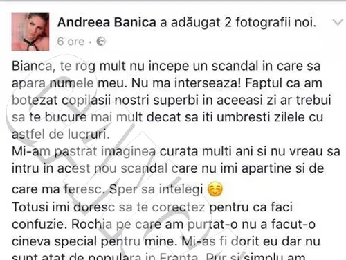 ”Bianca, te rog mult nu începe un scandal în care să apară numele meu. Nu mă interesează! Faptul că am botezat copilaşii nostri superbi în aceeaşi zi ar trebui să te bucure mai mult decât să îţi umbreşti zilele cu astfel de lucruri. Mi-am păstrat imaginea curată mulţi ani şi nu vreau să intru în acest nou scandal care nu îmi aparţine şi de care mă feresc. Sper să înţelegi. Totuşi îmi doresc să te corectez pentru că faci confuzie. Rochia pe care am purtat-o nu a făcut-o cineva special pentru mine. Mi-aş fi dorit eu, dar nu sunt atât de populară în Franţa. Pur şi simplu am cumpărat-o. Să vă trăiască Sofi şi să mai faceţi! Eşti o frumoasă!”, a fost mesajul Andreei Bănică pentru Bianca Drăguşanu.