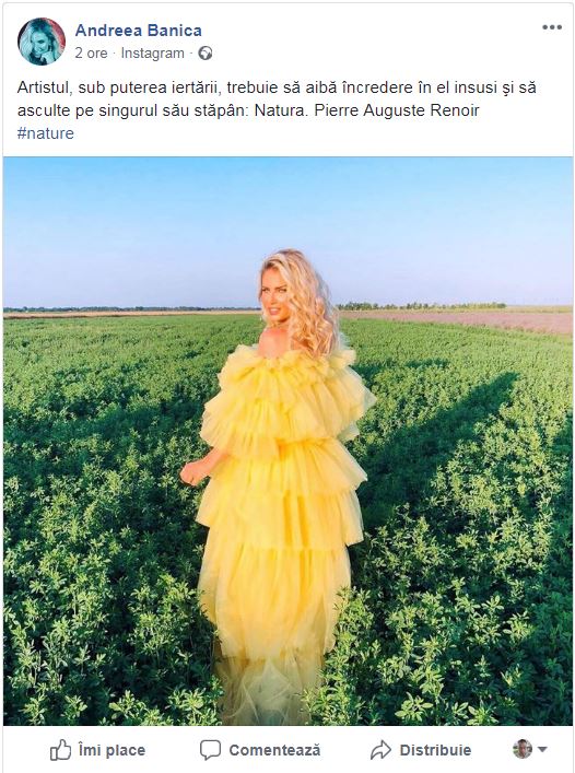 Andreea Bănică a postat pe contul său de Instagram câteva fotografii în care a îmbrăcat o rochie extrem de diafană, de culoare galbenă, dar asta nu a fost deloc pe gustul uneia dintre fane.
