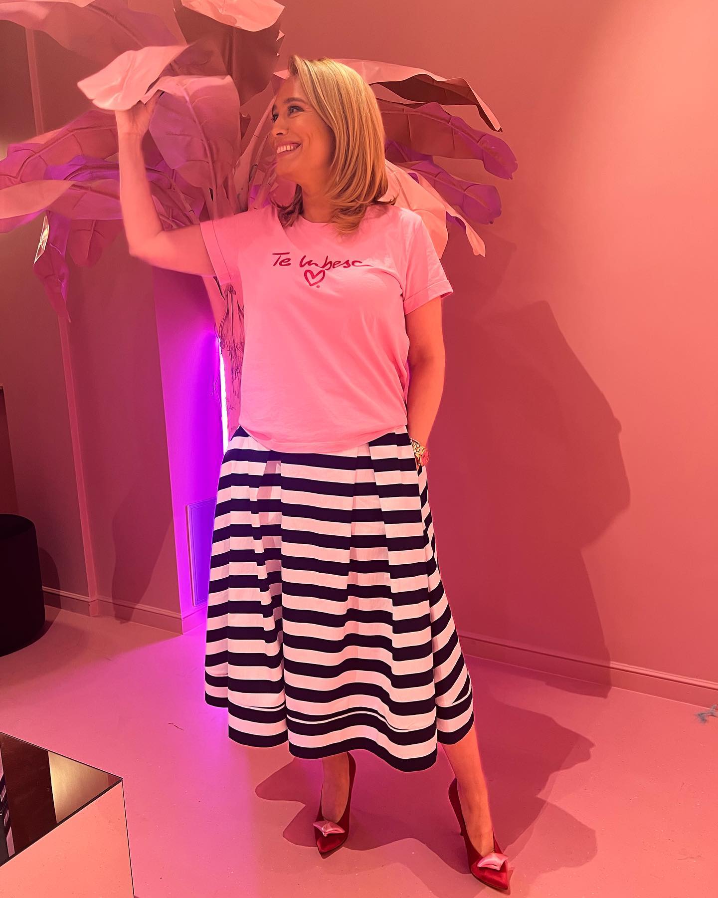 Recent, la un eveniment, prezentatoarea știrilor de la Pro TV a apărut îmbrăcată într-un tricou roz cu mesajul „Te iubesc”, o fustă alb-negru, în dungi, iar în picioare a ales pantofi roșii, cu toc accesorizaţi cu un detaliu roz în faţă.