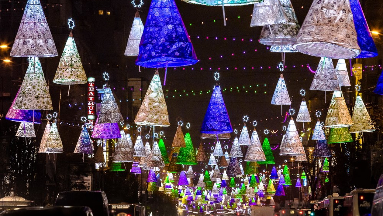 Brăduţii suspendati deasupra bulevardului sunt tare simpatici, iar culorile alese – verde şi albastru – sunt chiar originale.