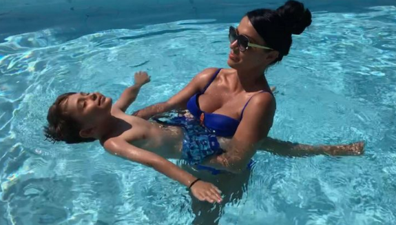 Prezentatoarea profită de vacanța scurtă pe care o are, înrte filmări, și se distrează alături de fiul ei, la piscină, unde îl învață să înoate.
