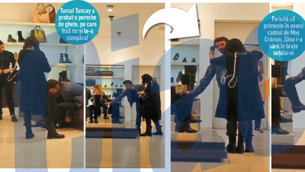 Cel mai probabil, incaltarile au fost darul turcului de Sfantul Andrei, desi, la cat de piperat a fost pretul, ele ar putea sa tina loc si de cadoul de Mos Nicolae. Oricum, a fost pentru prima data cand obiectivele aparatelor de filmat au surprins-o pe zana beneficiind de generozitatea vreunui partener. Cat despre Tuncay, de profesie fizioterapeut si osteopat, se aude ca ar castiga bani frumosi de pe urma cabinetului medical pe care l-a deschis in vara, in Bucuresti. Mai usor cu 1000 de lei, dupa aventura din magazin, dar cu chef sa vada si un film la cinema, Tuncay si-a dus apoi doamna la „Jocurile Foamei”. Dar nu oriunde, ci la sectorul VIP, ca sa nu fie nevoiti sa-si care singuri sucurile si cutiile voluminoase cu floricele.