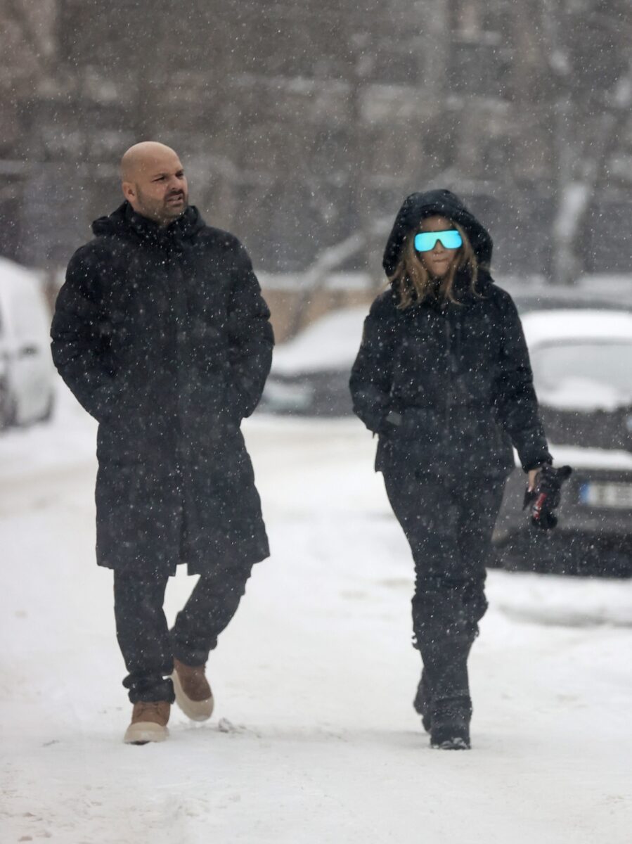 Partenera sa, în schimb, a abordat situația ceva mai precaut. Cu gluga trasă bine peste cap și ochelari de soare la ochi, aceasta părea pregătită pentru confruntarea cu fulgii care loveau din toate direcțiile. Ochelarii de soare au fost detaliul care ne-a atras atenția. Cadrul nu era tocmai o plajă exotică, dar ar fi fost mai degrabă o necesitate decât un accesoriu de stil. Ninsoarea era suficient de densă încât să îi îngreuna vizibilitatea. Îmbrăcată într-o ținută închisă la culoare, potrivită pentru temperaturile scăzute, iubita artistului pășea atent pe trotuarul alunecos, în timp ce el mergea relaxat, cu mâinile în buzunare.