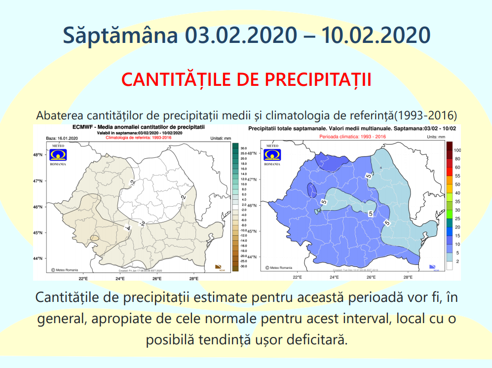 Estimările meteorologice pentru patru săptămâni sunt realizate de către ECMWF – Centrul European pentru Prognoze pe Medie Durată. Este estimată media săptămânală a abaterilor temperaturii aerului și a cantităților de precipitații față de media perioadei 1993-2016. Fenomenele extreme cu o durată scurtă de manifestare nu pot fi prognozate cu ajutorul acestui produs.