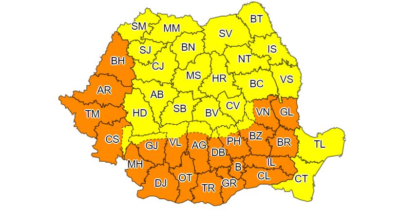 Codul portocaliu se va aplica pentru aproximativ jumătate de țară. Va fi caniculă în Crișana, Banat, Oltenia, Muntenia și în sudul Moldovei. Temperaturile se vor situa între 37 și 39 de grade Celsius. Temperaturile minime vor fi între 18 și 24 de grade Celsius.