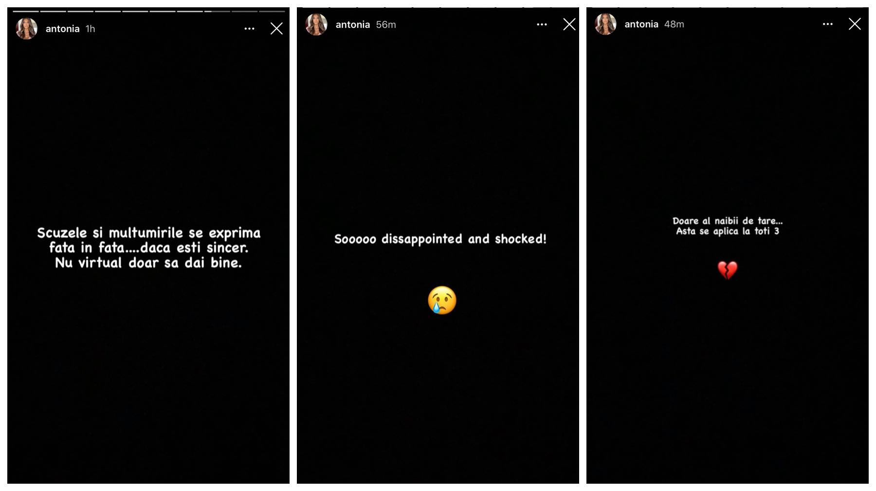 ”Scuzele și mulțumirile se exprimă față în față… dacă ești sincer. Nu virtual doar să dai bine. Sunt foarte dezamăgită și șocată. Doare al naibii de tare. Asta se aplică la toți 3”, a spus Antonia pe Instagram. Ulterior, artista a șters mesajele publicate.