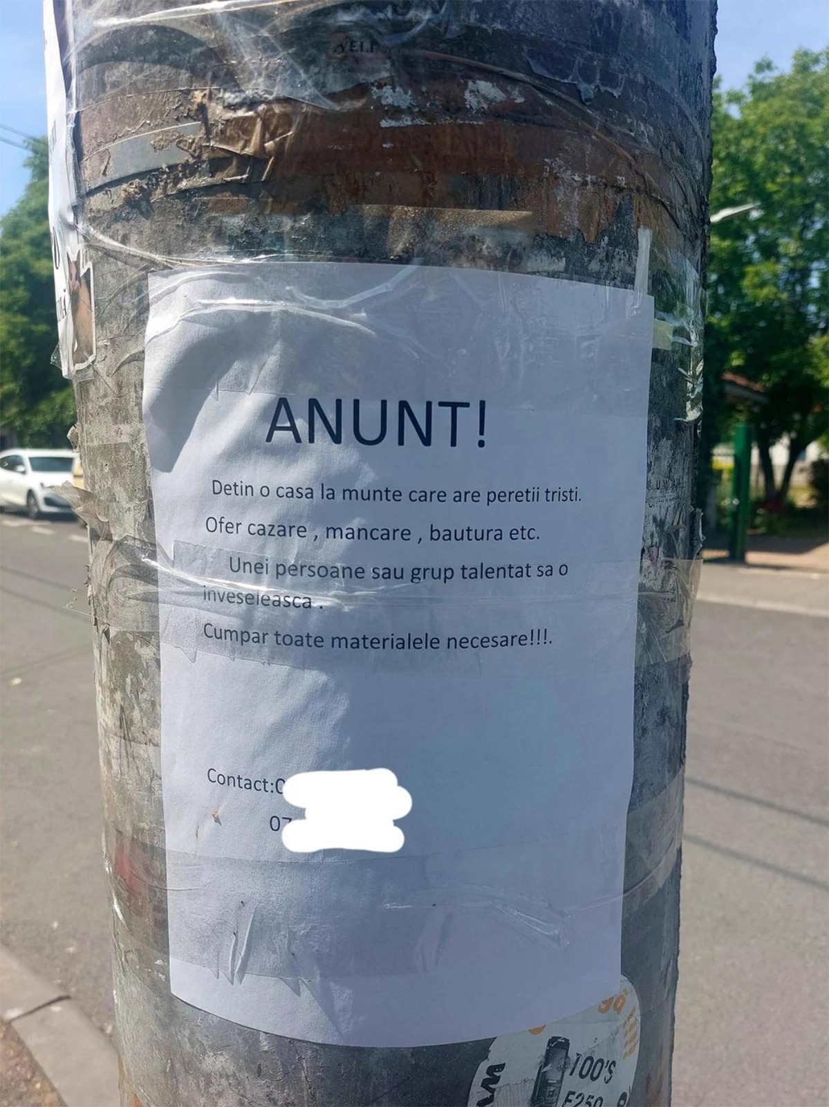 ”ANUNȚ! Dețin o casă la munte care are pereți triști. Ofer cazare, mâncare, băutură etc unei persoane sau grup talentat ca să înveselească. Cumpăr toate materialele necesare!!!”, se arată în anunțul Clujeanului.