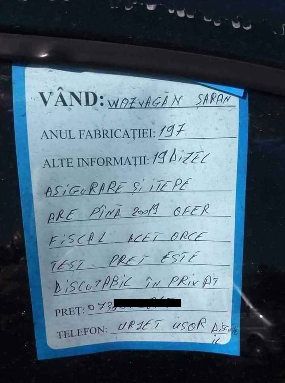 „Vând Wazvagăn Șaran, anul fabricației 197. Alte informații: 19 Dizel, asigurare și itepe, are până 20019, ofer fiscal, acet orce test, preț este discutabil în privat. Urjet ușor discutabil”, se arată în anunțul de vânzare.