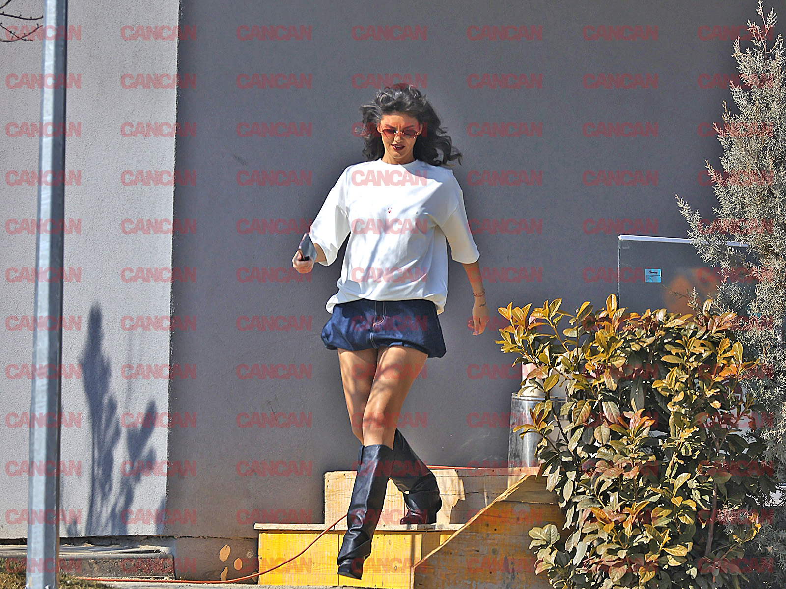 Atenție, și-a făcut apariția Ramona Olaru! Și ce apariție! Pe scările unui birou de vânzări din Pipera și-a etalat tot ce are mai bun, un fizic impresionant, dar a avut și ”accesoriile” care s-o scoată și mai mult în evidență, în care minuscula fustiță a jucat rolul principal. O fustiță albastră, pe care o zărește mai bine după ce te freci la ochi! Tricoul alb, imaculat, a avut rolul lui, iar cizmele, până la genunchi, au ”operat” și ele la imaginea sexy a vedetei.