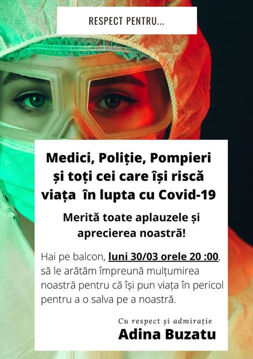 ”Medici, Poliție, Pompieri și toți cei care își riscă viața în lupta cu COVID-19 merită toate aplauzele și apreciarea noastră! Hai pe balcon, luni 30.03, ora 20:00, să le arătăm împreună mulțumirea noastră pentru că își pun viața în pericol pentru a o salva pe a noastră. Cu respect și admirație, Adina Buzatu”, a fost apelul Adinei Buzatu.