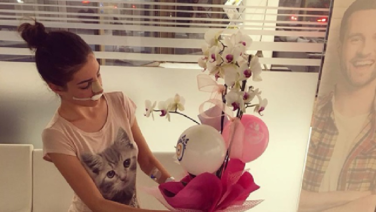 Lorena este foarte fericită că a reușit să scape de complexul pe care l-a avut și Andreea Tonciu, sora ei. Tânăra s-a pozat alături de un buchet de flori. Are nasul bandajat, dar pare foarte fericită și mândră de noul ei chip.