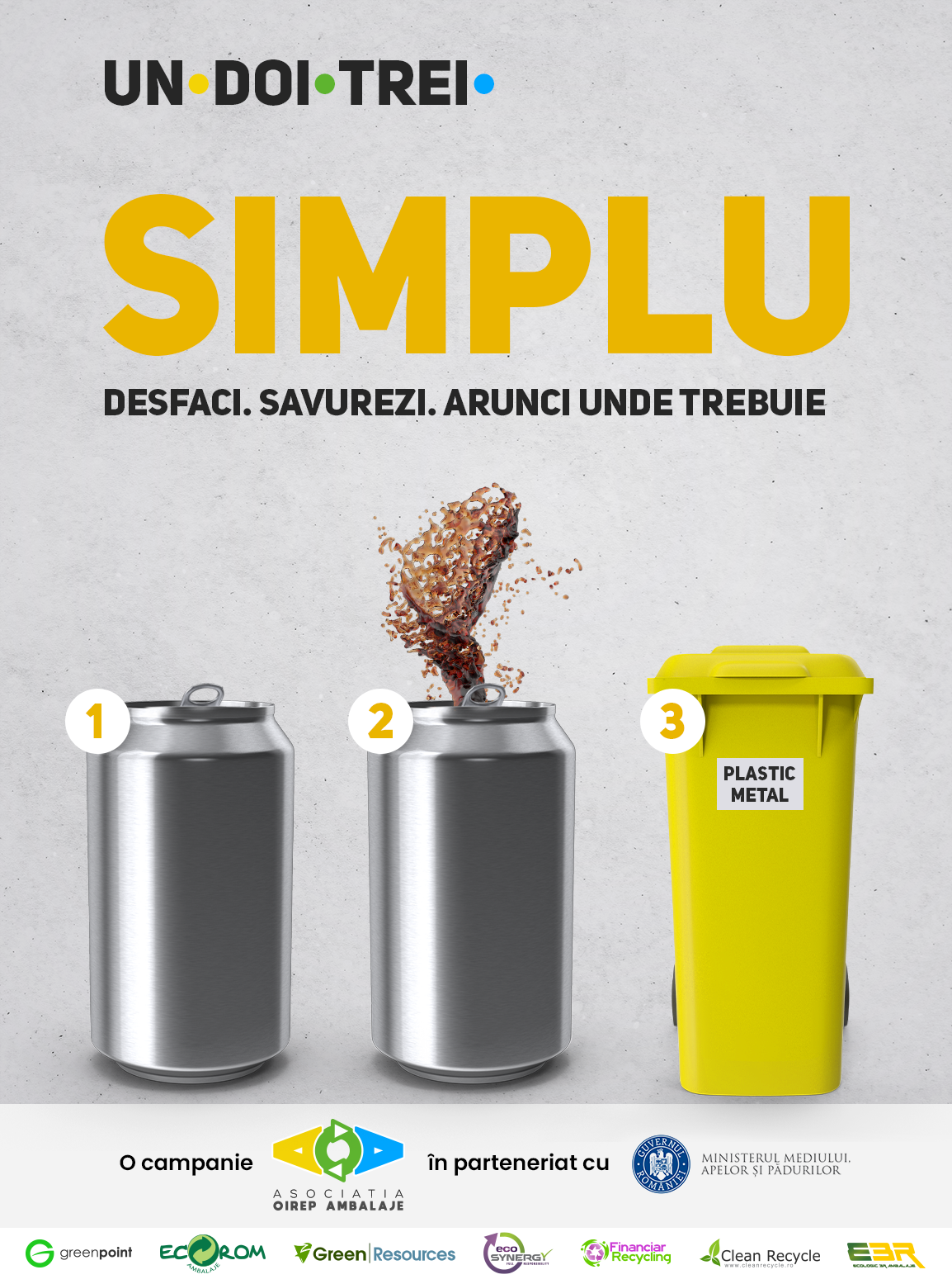 Pentru a schimba un comportament este nevoie de timp, dar, mai ales, de educație. De pași repetați până când aceștia ajung să fie făcuți mecanic sau din reflex. Campania Un’ Doi Trei se bazează pe o idee simplă: Desfaci. Folosești. Arunci unde & cum trebuie. Să colectezi separat este SIMPLU | de BUN SIMȚ | NORMAL | CIVILIZAT.