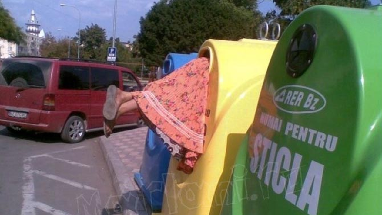 O femeie din Buzau a fost victima unui tomberon ecologic special pentru reciclarea deseurilor, in timp ce incerca sa ajunga la continutul acestuia, in cautarea unor resturi de mancare.