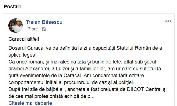 După trei zile de bâjbâieli, ancheta a fost preluată de DIICOT Central şi de cea mai profesionistă echipă de poliţişti investigatori, adusă tot de la Bucureşti. Dacă în primele zile toţi am avut tot dreptul din lume să criticăm prestaţia instituţiilor statului, după preluarea anchetei de către DIICOT Bucureşti şi criminaliştii de mare prestigiu de la Poliţia Capitalei, speculaţiile cu privire la profesionalismul şi corectitudinea procurorilor şi poliţiştilor ar fi trebuit să înceteze, iar încrederea într-o anchetă corectă să fie restabilită. Este o anchetă care va da dimensiunea profesională a două notabilităţi şi a echipelor lor: Felix Bănilă, procurorul şef al DIICOT, şi investigatorul Radu Gavriş, poliţistul care are zero, repet, zero eşecuri în investigarea omorurilor din Bucureşti. În opinia mea, acest tandem elimină orice bănuială de incorectitudine sau lipsă de profesionalism a investigaţiei. Mai mult, ancheta nu se va opri la cazurile Alexandra şi Luiza. Dacă presupusul făptuitor este un criminal în serie sau dacă în spatele celor două crime se află şi o vastă activitate de trafic de fiinţe umane, nu există nicio şansă ca cei interesaţi să poată muşamaliza ancheta”, a scris Traian Băsescu pe Facebook.