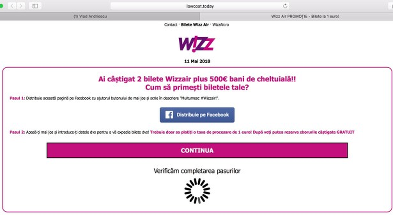 ”Câte săptămâni au trecut de la scandalul Cambridge Analytica? Ei bine, 35.000 de oameni apreciază această pagină care spune că primești bilet gratuit la WizzAir dacă bifezi 3 răspunsuri, scrii pe Facebook Mulțumesc WizzAir și dai un euro. Bravo celor care au făcut acest scam. Uneori apreciezi mai mult hoțul, decât prostul”, a scris Vlad Andriescu pe Facebook.