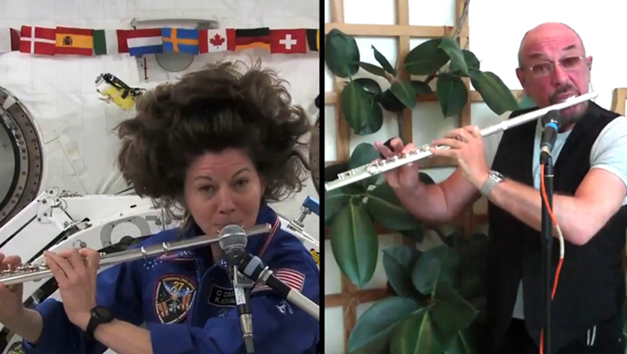 Astronautul Cady Coleman de pe Statia Spatiala Internationala a cantat la flaut in cosmos, realizand un duet inedit cu muzicianul Ian Anderson, de la Jetro Tull, aflat pe Pamant, mai exact la Permn, in Rusia, unde a sustinut un concert.