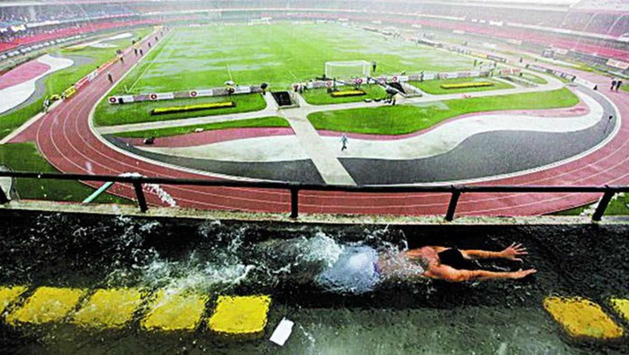 In doar doua ore de ploaie torentiala, Stadionul Morumbi din Sao Paolo s-a inundat atat de tare incat tribunele au fost acoperite de apa, spectatorii mai indrazneti si cu simtul umorului incumetandu-se sa faca o baie in piscina improvizata.