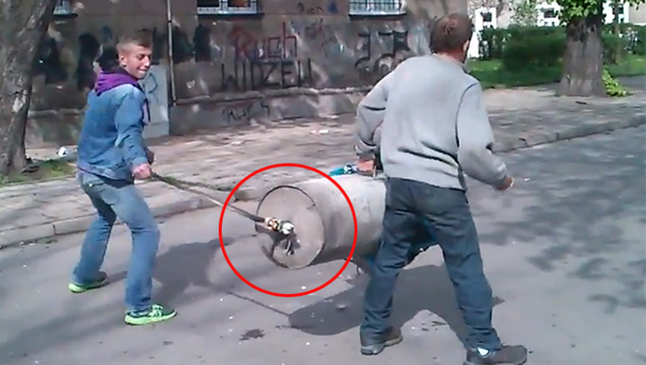 Un filmulet inedit face senzatie in aceste zile pe Internet. In imagini apar doi barbati, care au construit un tun artizanal si i-au facut "proba" in plina strada.