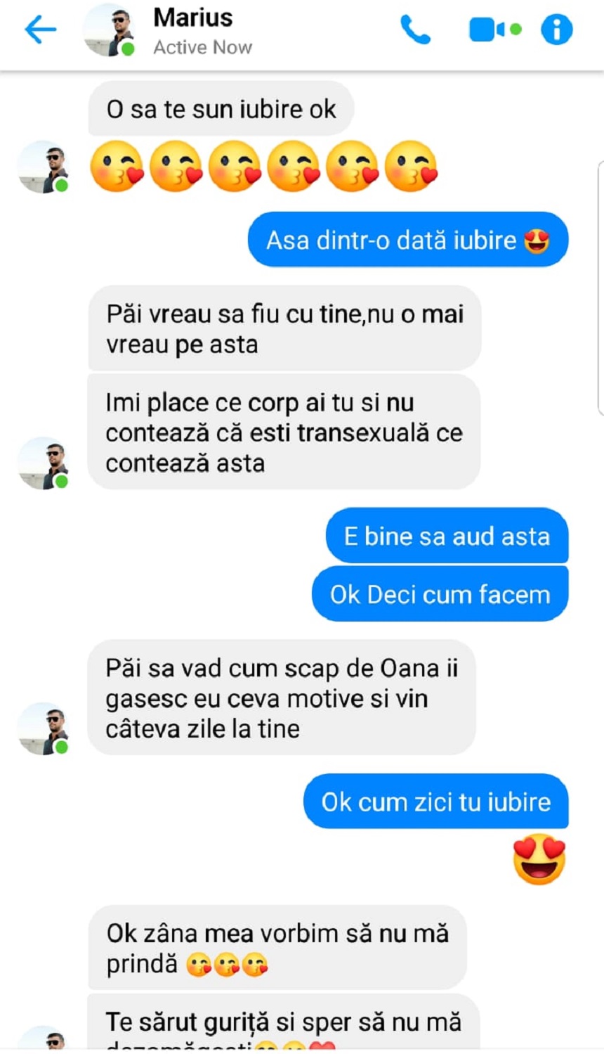 ”Ți-am dat așa că îmi caut o amantă dacă s-ar putea / Păi vreau să fiu cu tine, nu o mai vreau pe asta. Îmi place ce corp ai tu și nu contează că esti transsexuală, ce contează asta”, sunt doar câteva din mesajele pe care le-ar fi trimis Marius Elisei.
