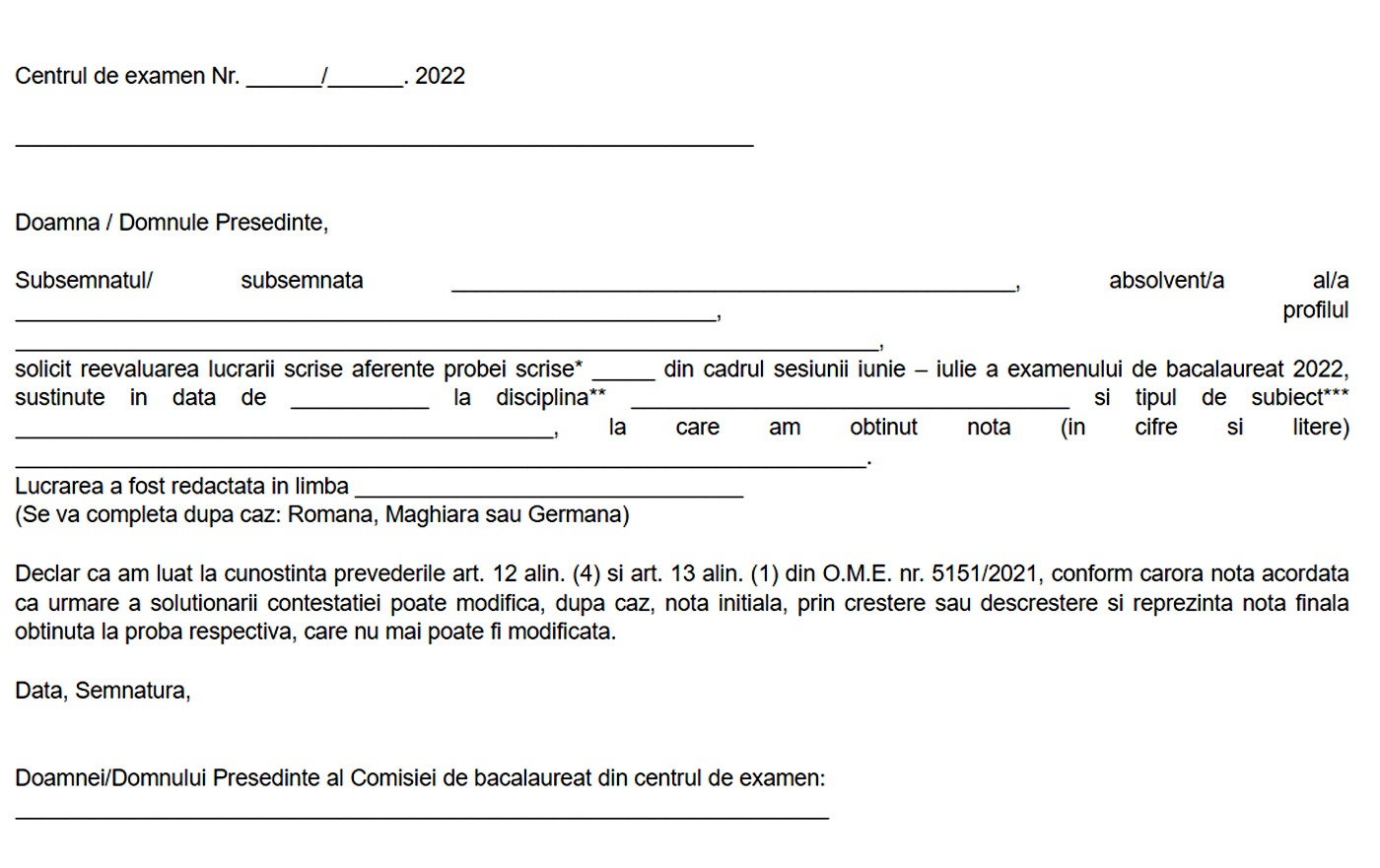 Pentru a completa corect cererea de recorectare a unei lucrări, un elev va fi nevoit să își scrie numele și prenumele, liceu absolvit, profilul, data în care a susținut examenul, disciplina pentru care dorește recorectarea lucrării, nota obținută inițial și limba în care lucrarea a fost redactată. De asemenea, va trebui să se semneze și să treacă data corectă în care completează cererea. Vă reamintim faptul că aceste contestații se vor putea depune numai mâine, 27 iunie 2022, în intervalul 12:00-18:00. Orice contestație depusă ulterior nu va mai fi luată în considerare.