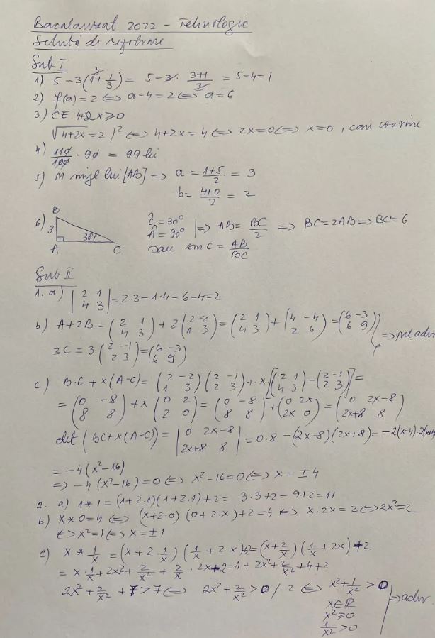 Rezolvarea subiectelor de la proba de Matematică, profilul Tehnologic