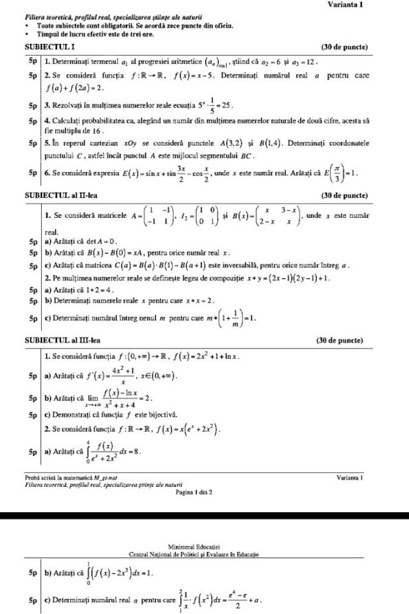 Subiectele de la Matematică pentru profilul Științele Naturii