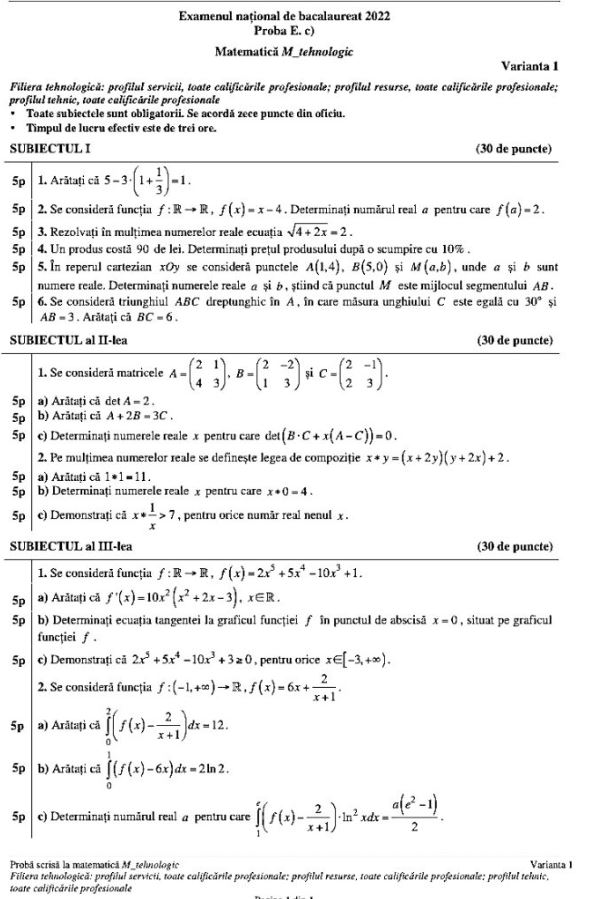 Subiectele de la Matematică pentru profilul Tehnologic