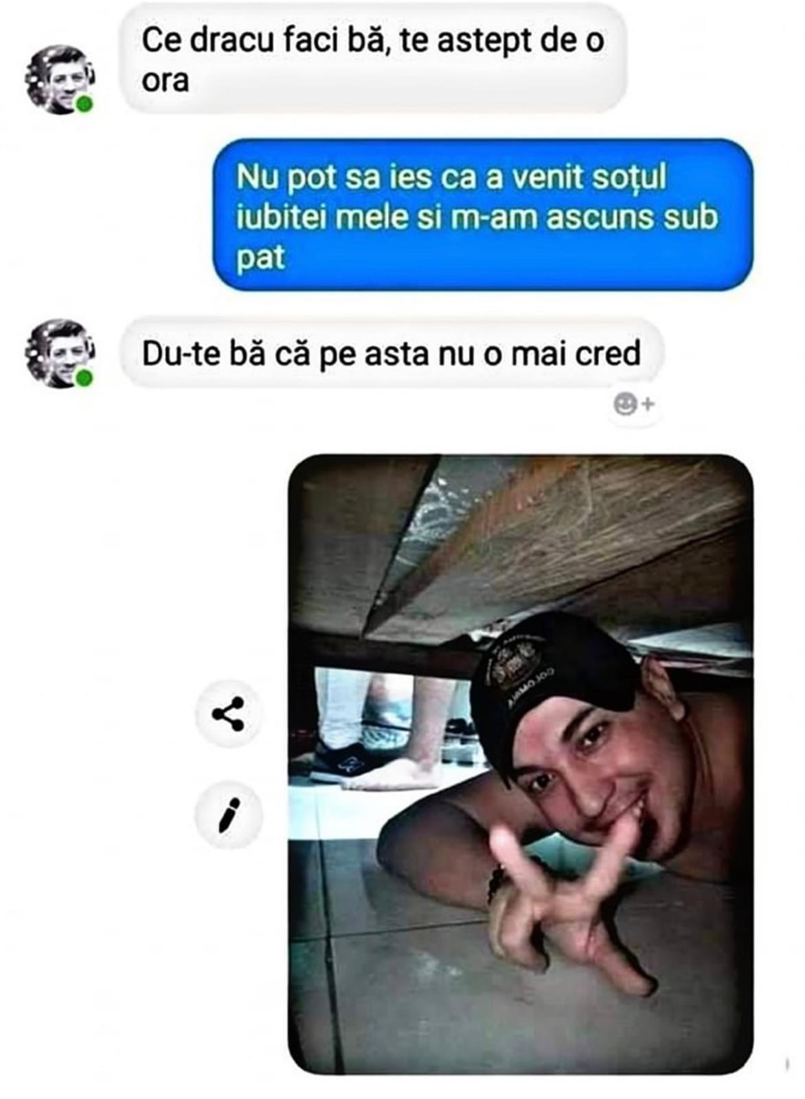 – Nu pot să ies că a venit soțul iubitei mele și m-am ascuns sub pat.
