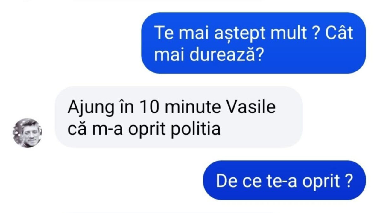 – Ajung în 10 minute, Vasile, că m-a oprit poliția.