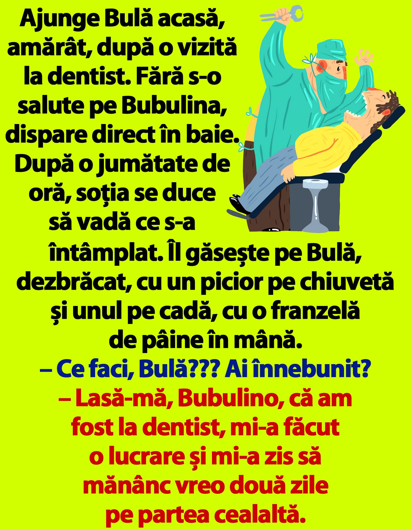 – Lasă-mă, Bubulino, că am fost la dentist, mi-a făcut o lucrare și mi-a zis să mănânc vreo două zile pe partea cealaltă.