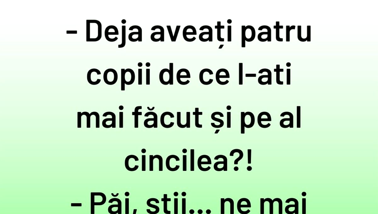 Dragă cititorule, CANCAN.RO îți aduce zâmbetul pe buze cu un banc tare haios. Doi părinți sunt întrebați de ce au luat decizia de a mai face al cincilea copil. Răspunsul lor a provocat hohote de râs.