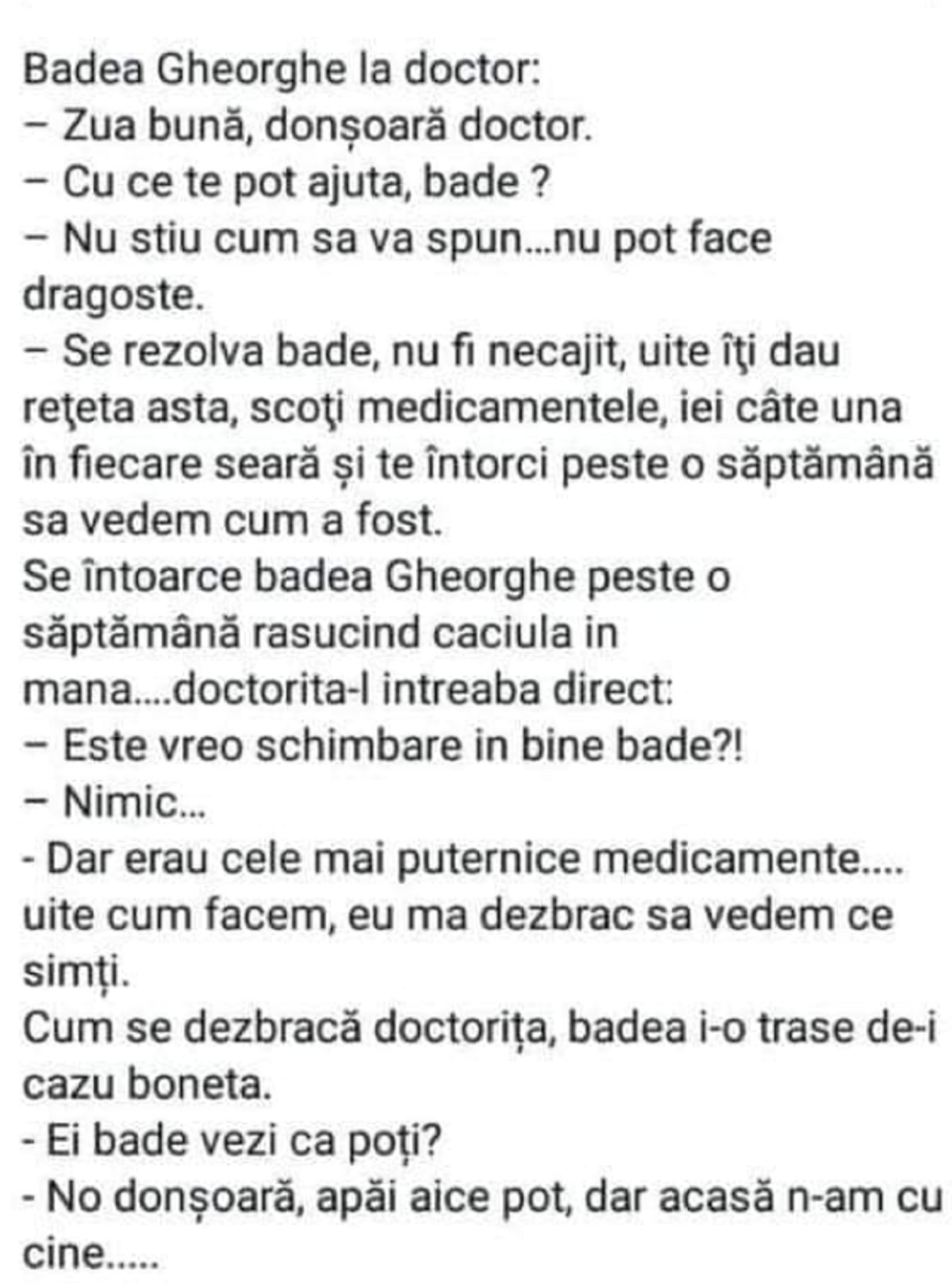 Se întoarce badea Gheorghe peste o săptămână răsucind căciula în mână. Doctorița îl întreabă direct: