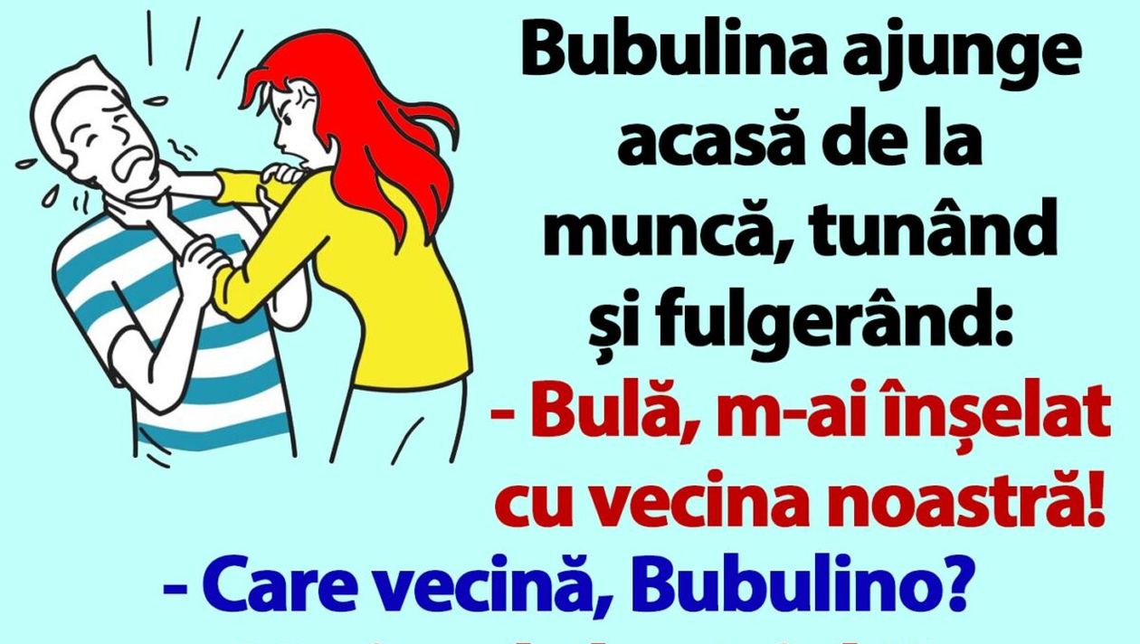 BANC | Bubulina ajunge acasă de la muncă, tunând și fulgerând: „Bulă, m-ai înșelat cu vecina noastră!”