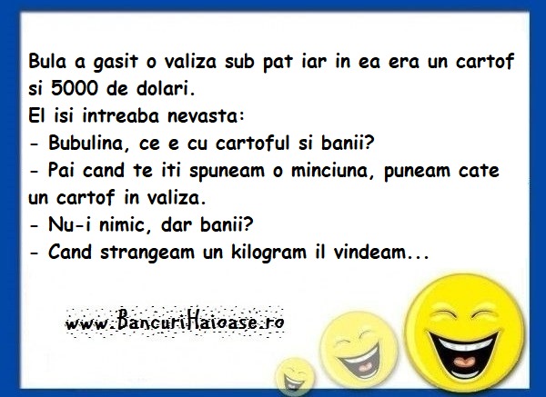 Bulă a găsit o valiză sub pat, iar în ea era un cartof și 5.000 de dolari. El își întreabă nevasta: