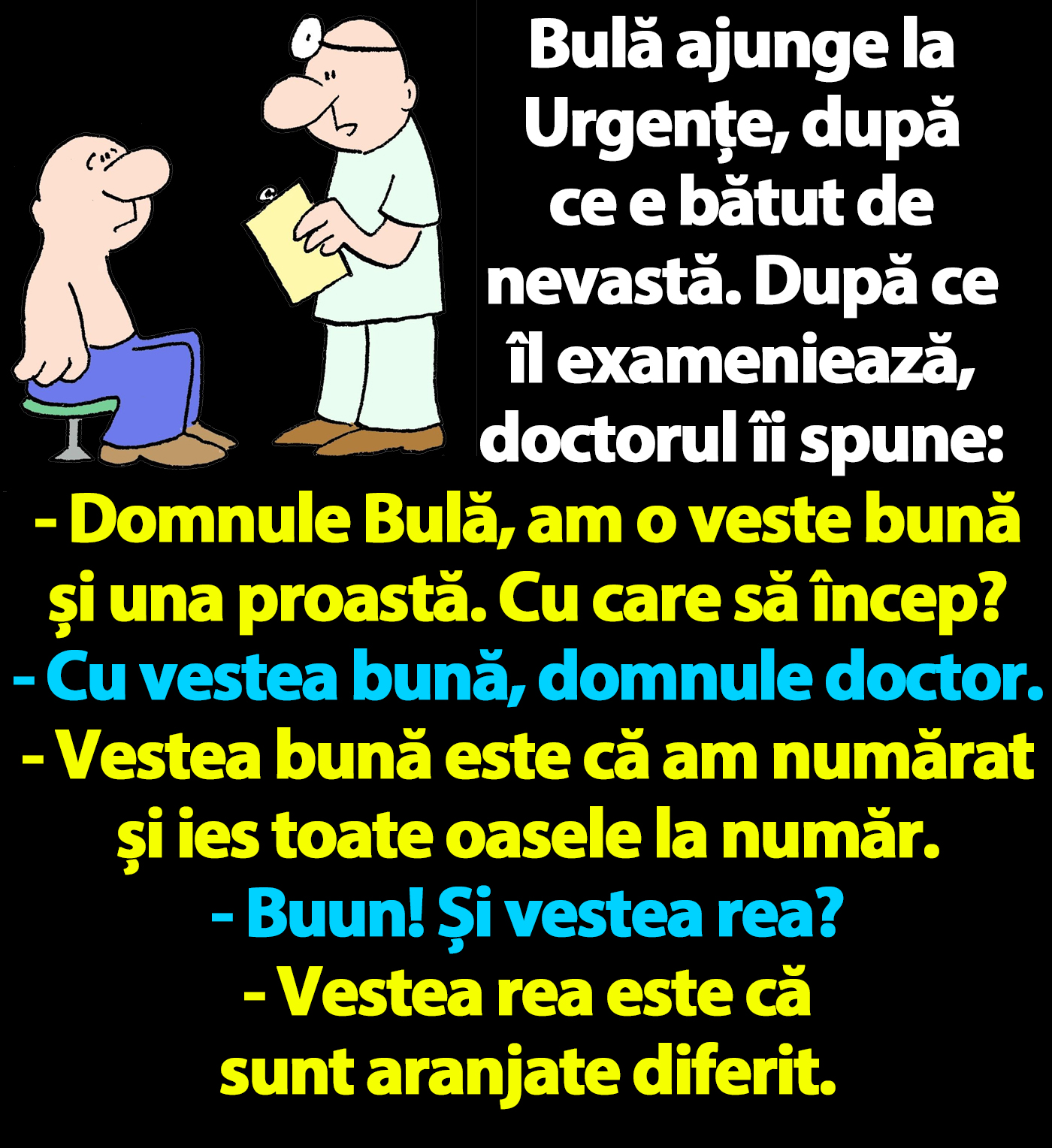 Bulă ajunge la Urgențe, după ce e bătut de nevastă. După ce îl exameniează, doctorul îi spune: