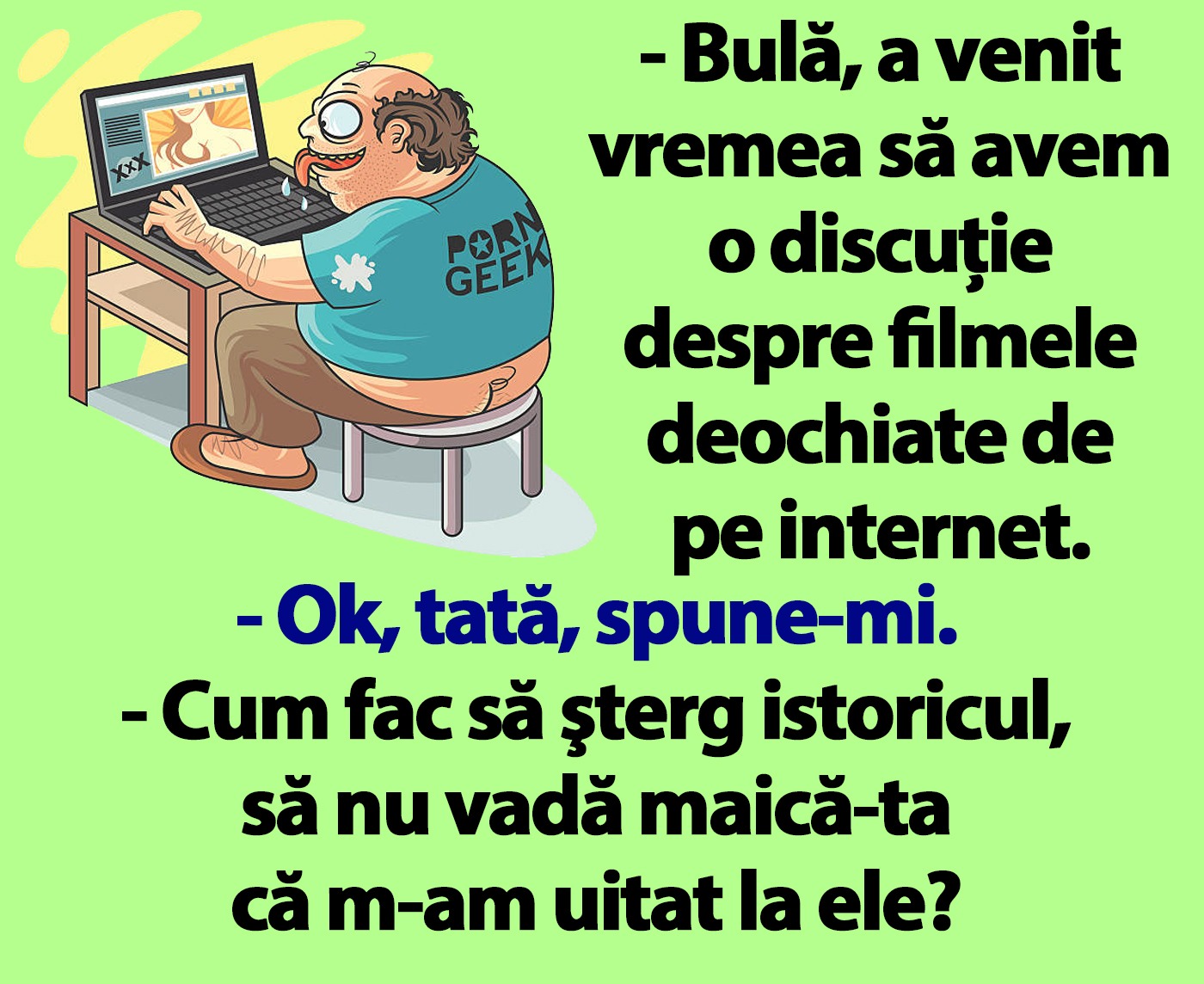 Ziua bună se cunoaște încă de dimineață, așa că trebuie începută cu zâmbetul pe buze. Iar pentru asta am pregătit un banc care cu siguranță te va amuza copios. Protagonistul de astăzi este Bulă, care are „marea discuție” cu tată lui. Deznodământul este hilar.