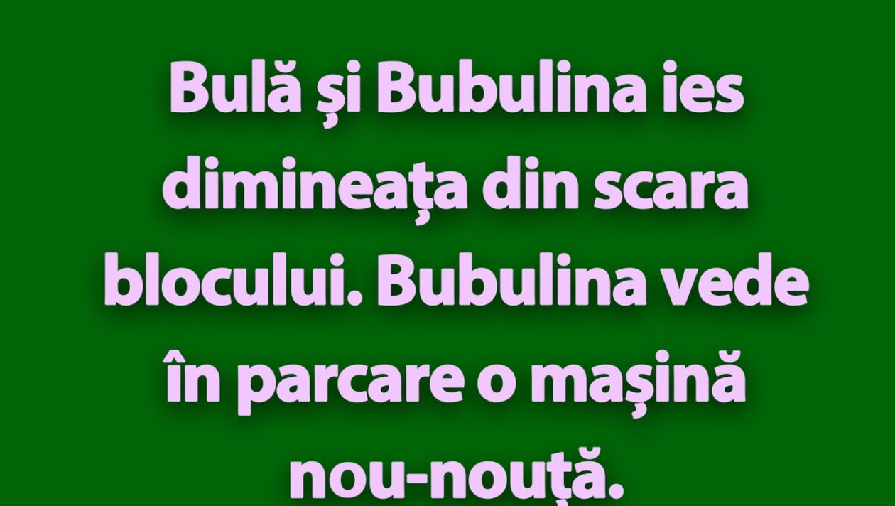 Dragi cititori, pentru o porție de râs copioasă noi vă prezentăm un nou banc cu Bulă și Bubulina. El încearcă să-i facă o surpriză soției lui, însă aceasta dă cu bâta-n baltă. Vei râde cu lacrimi!