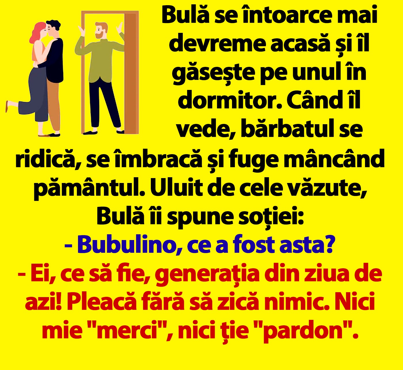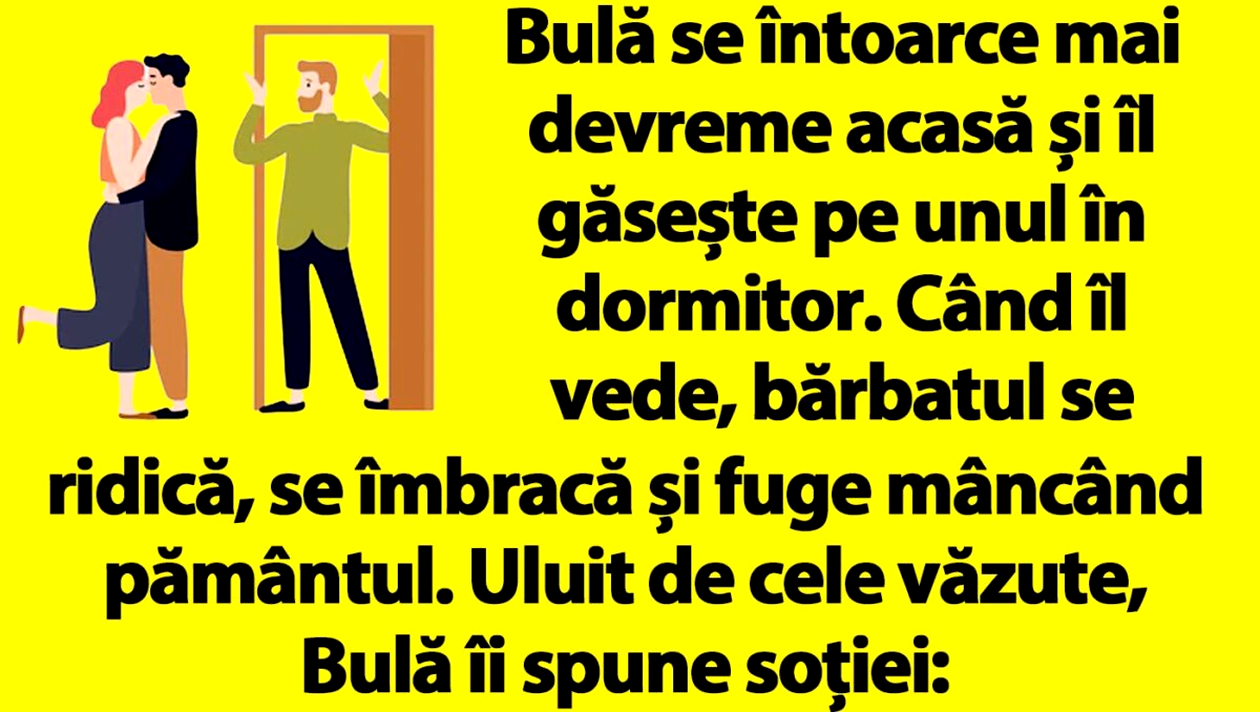 Bulă se întoarce mai devreme acasă și îl găsește pe unul în dormitor. Când îl vede, bărbatul se ridică, se îmbracă și fuge mâncând pământul. Uluit de cele văzute, Bulă îi spune soției: