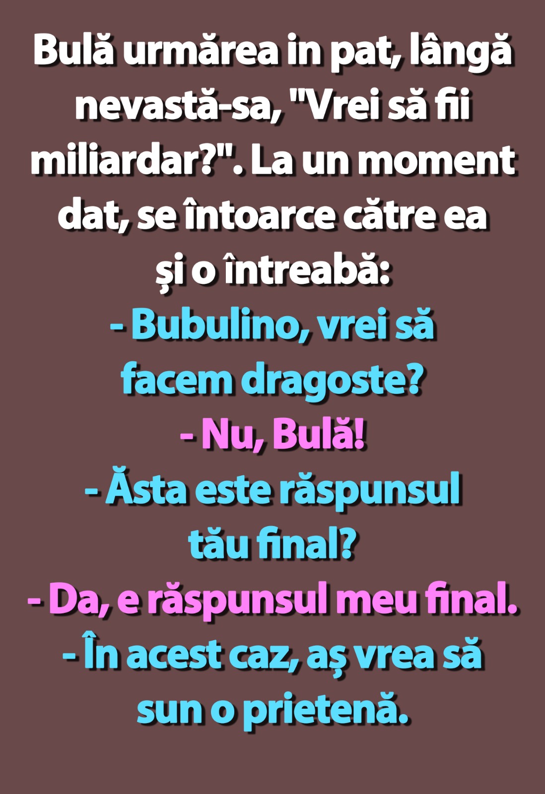 Bulă urmărea in pat, lângă nevastă-sa, „Vrei să fii miliardar?”. La un moment dat, se întoarce către ea și o întreabă: