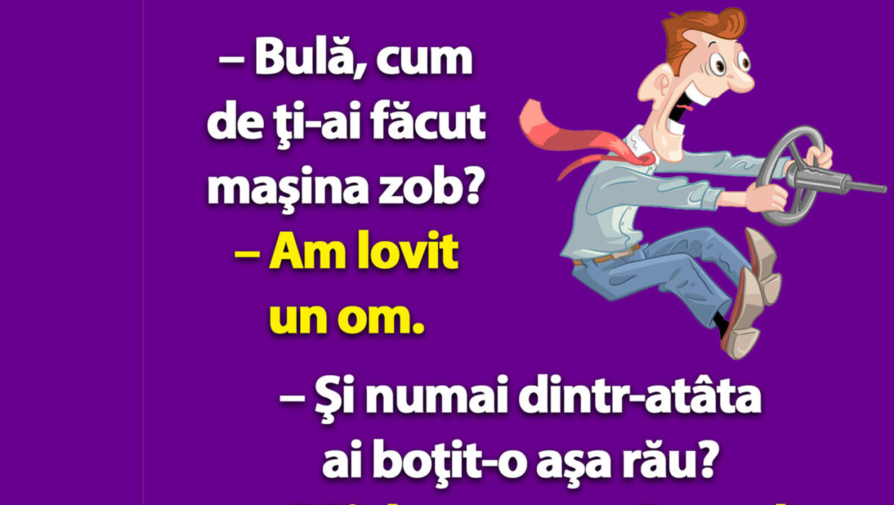 Ziua bună trebuie începută cu zâmbetul pe buze, așa că am pregătit un banc, care, cu siguranță, o să te amuze copios. Protagonistul de astăzi este Bulă. Acesta a făcut un accident cu mașina, iar deznodământul este hilar.
