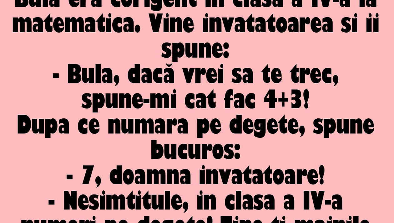– Nesimțitule, în clasa a IV-a numeri pe degete! Ține-ți mâinile la spate! Spune-mi cât fac 4+4!
