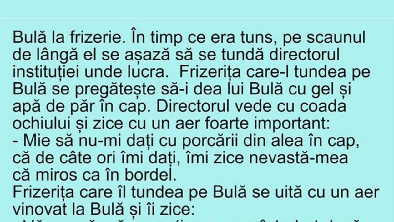 CANCAN.RO ți-a pregătit un banc de nota 10. Discuția haioasă dintre Bulă, directorul instituție unde el lucra și o frizeriță s-a viralizat rapid. Spor la râs și voie bună!