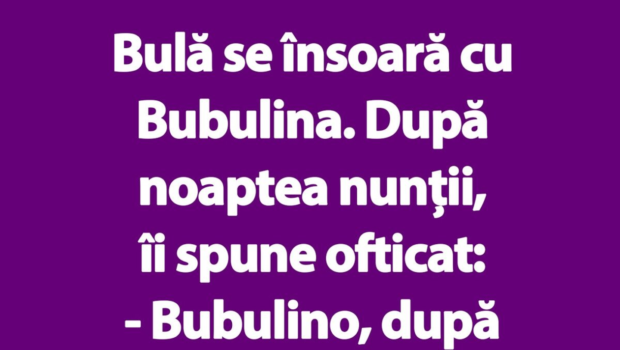 Dragi cititori, CANCAN.RO a pregătit pentru un banc excepțional cu Bulă, personajul preferat al românilor. Gluma îl înfățișează alături de proaspăta lui soție, Bubulina. Discuția pe care cei doi o poartă în noaptea nunții este genială. Spor la citit și voie bună!
