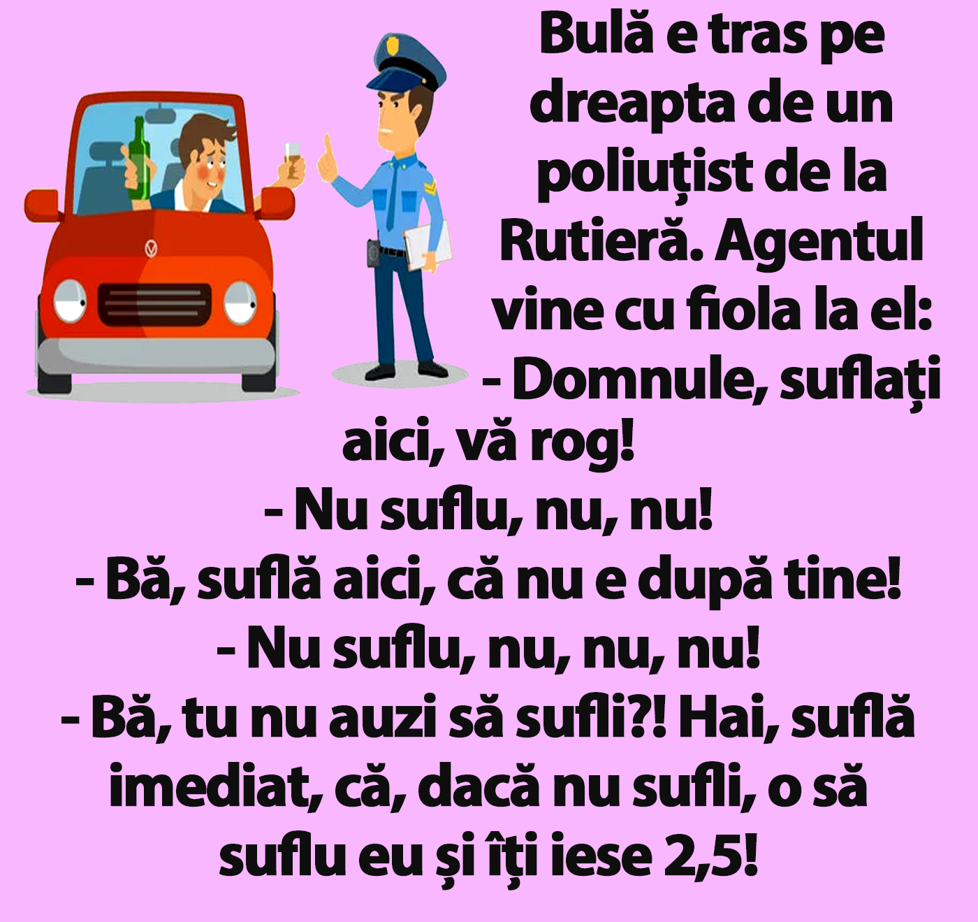 – Bă, tu nu auzi să sufli?! Hai, suflă imediat, că, dacă nu sufli, o să suflu eu și îți iese 2,5 lei!”, a fost bancul de astăzi.