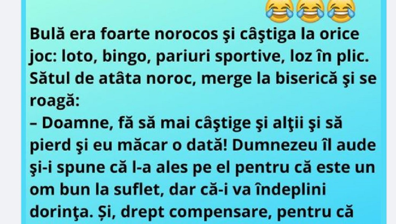 Dragă cititorule, CANCAN.RO ți-a pregătit un banc de nota 10. Bulă era foarte norocos și câștiga la orice joc de noroc: loto, bingo, loz în plic și pariuri sportive. Sătul de atâtea premii, merge la biserică și îl roagă pe Dumnezeu să îi mai lase și pe alții să câștige.