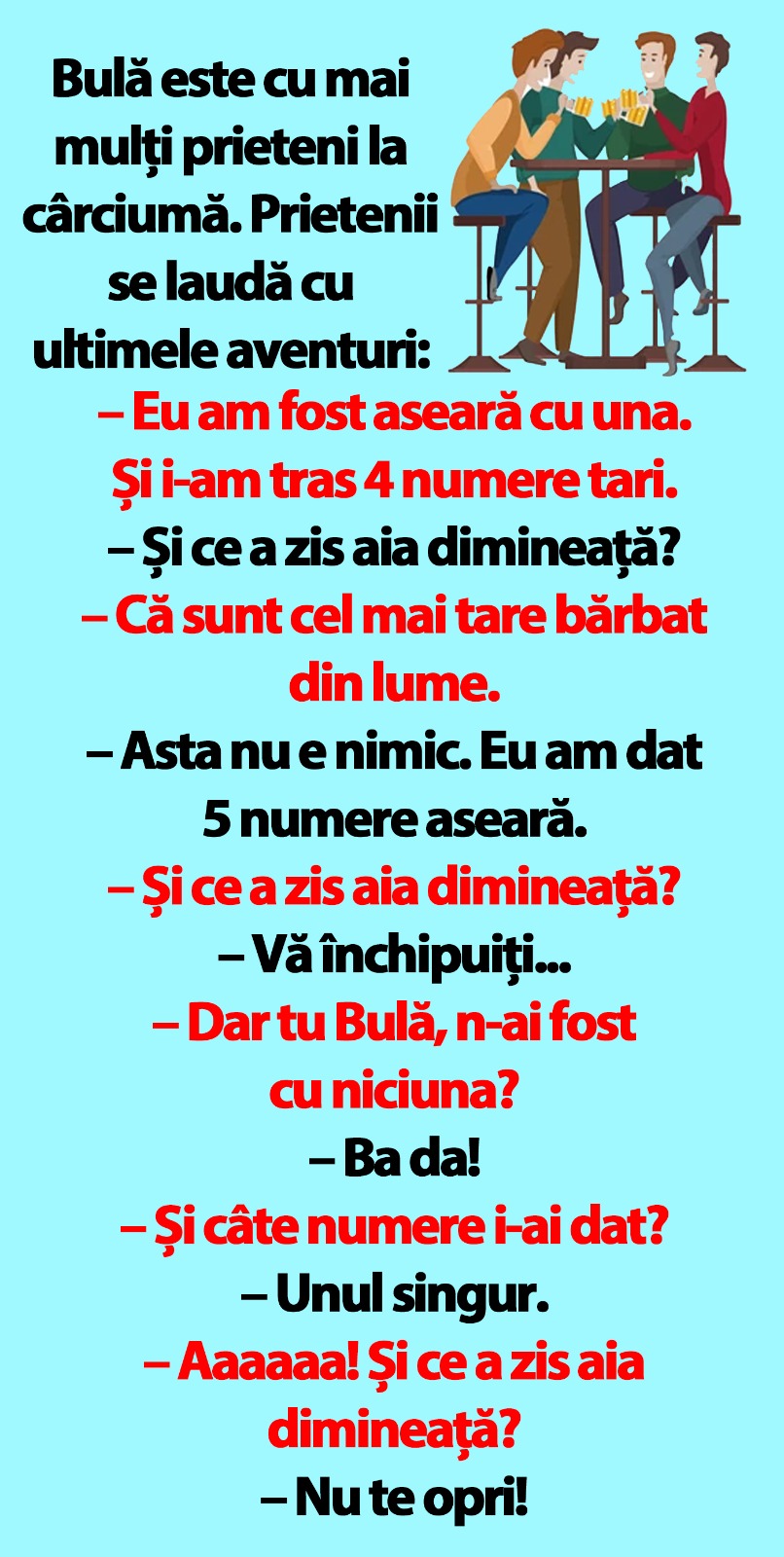Bulă este cu mai mulți prieteni la cârciumă. Prietenii se laudă cu ultimele aventuri: